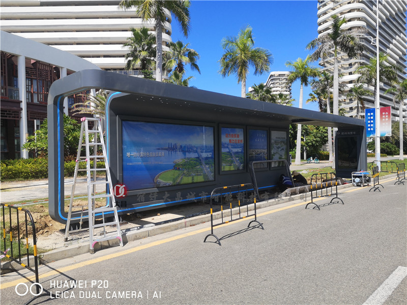 公交站臺候車亭主體顏色為灰色,采用304不銹鋼材質制作而成。海南島四面環海,海水是自然界中量大、腐蝕性較強的一種天然電解質,采用304不銹鋼材質,表面經過高溫靜電噴涂處理,可以確保公交站臺候車亭具有較好的抗腐蝕性。為了凸顯崖州灣科技城現代化的科技元素,此款候車亭頂部采用星空頂的做法,夜間會變幻出五顏六色的燈光效果。此外,在候車亭的頂部及立柱周邊也增加了LED柔性光源,進一步增加了夜間亮化效果,既美觀又實用!
